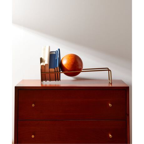スロープを木製ボールがゆっくり動き、本やレコードなどを抑えてくれるブックエンド。