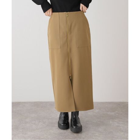ワークディテールのスカートに、ジップ使いと深めのスリットで少しエッジを効かせたデザインです。