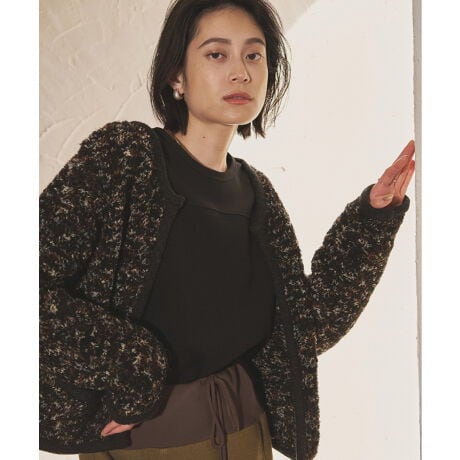 ミックスカラーの色使いでシーズンムードを盛り上げる、ブークレ素材が可愛いニットジャケット