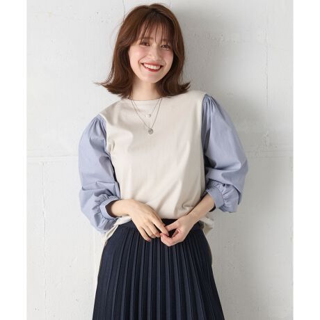 シャーリングの袖が着映えるポイント!ドッキングデザイントップス