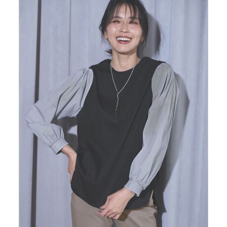 シャーリングの袖が着映えるポイント!ドッキングデザイントップス