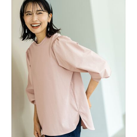 シャーリングの袖が着映えるポイント!ドッキングデザイントップス