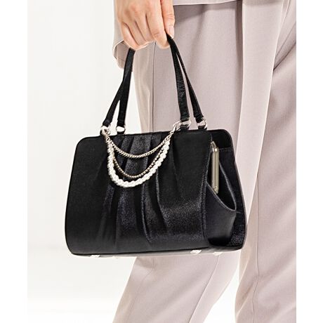 繊細な光沢を放つサテン調素材に、フロントの美しいプリーツが上品な立体感を添えるハンドバッグ。
