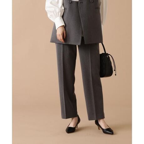センタープレスを施した、きちんと見えするテーパードパンツ。腰まわりはゆとりがあり、裾に向かって細くなるテーパードシルエットです。ウエストの後ろはゴムを入れているので伸縮性があり、はき心地が良い仕上がりに。シャツブラウス、ニットプルオーバーまで幅広く着回しできます。シンプルで飽きがこないデザインは、通勤オンスタイルにもキレイめなオフの日にもお勧め。同シリーズのジレ(店舗商品番号1664155101)を揃えれば、セットアップスタイルとしても着用いただけます。