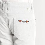 カラー09ホワイトには人気の高いヨコ黒ストレッチツイルを使用。綾目からチラチラ見える黒糸が他にはない色目を表現しております。カラー49インディゴブラックには10.5OZのインディゴデニムに黒コーティングを施し、黒の引き締まった色目と陰影のある加工感を出しています。両素材共によく伸び、しっかりと縮むストレスフリーな履き心地が特徴。