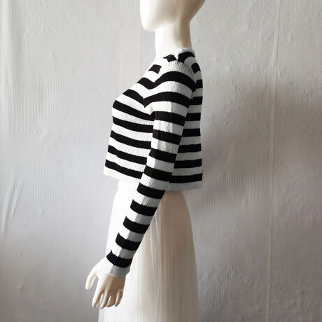 薄手ニット生地で優しい肌触りを与える、ボーダー柄のデザインもレトロなお洒落感を演出するニットトップス