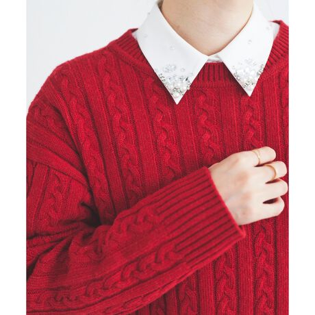 パールとビジューをあしらった襟がポイントのアクセサリー要らずの華やかシャツ。