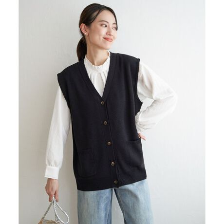 ボタンを閉めて一枚でも、開けてジレ風にも使えるニットベスト。