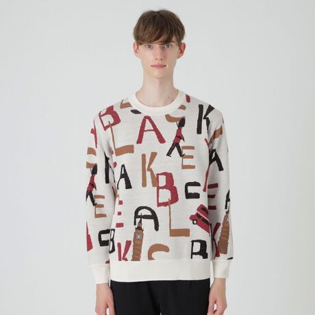 【全面にロゴを散りばめた遊び心あるクルーネックニット】