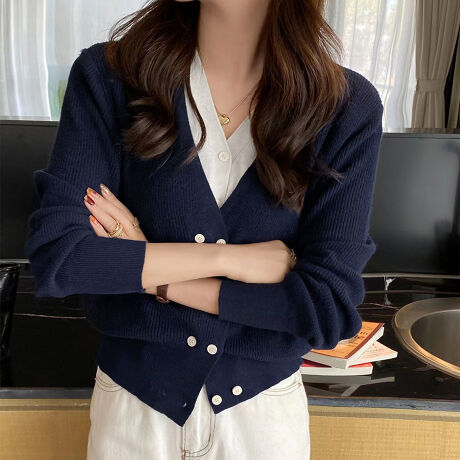 バイカラーがアクセントになり、1枚でレイヤードスタイルになるニットトップス