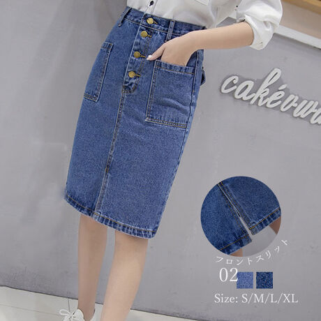 ハイウエストでお腹周りをすっきり見せつつ、脚長効果も狙えるデニムスカート