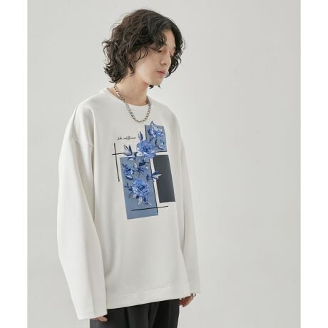 アートフラワーを重ねて立体感を出しています。また異なる手法を組み合わせ表情豊かで一枚でコーデが決まります。ワイドスリーブシルエットなので単品でもスタイリングを楽しめます。