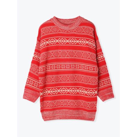 [型番:23560673914]幾何学模様のジャカードニットがシーズンムードも高めてくれるチュニック。ボディラインを優しくカバーしてくれる長めの着丈もポイント。パンツやスカートなど、どんなアイテムとも合わせやすく、デイリーユースにも重宝しそうな1着です。