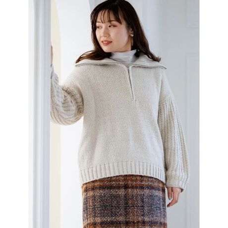 畦編み切替を施したトレンドのハーフジップニットプルオーバー。