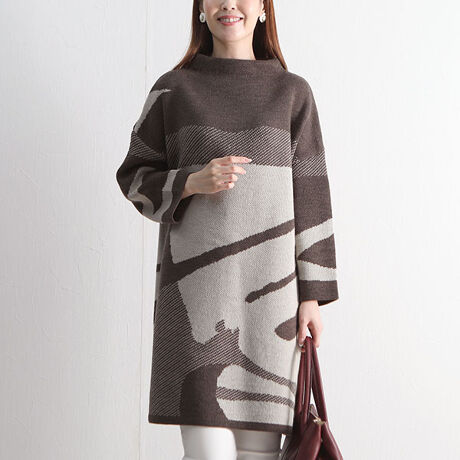 【大きいサイズ】 日本製ゼブラ柄ハイネックロング丈ニット 大きいサイズ レディース チュニック 長袖