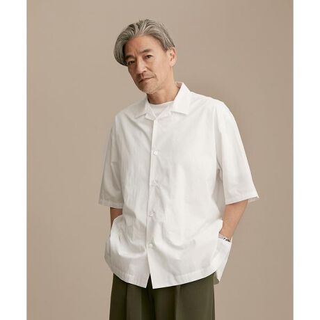 80/-コンパクトヤーンの高密度ツイル素材を使用したオープンカラーシャツ。