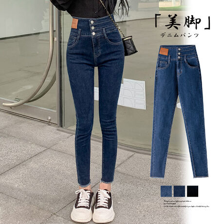 ハイウエスト&引き締め3連ボタンでキレイに魅せる、ストレッチ素材だから脚にぴったりフィットで美しいスキニーラインに