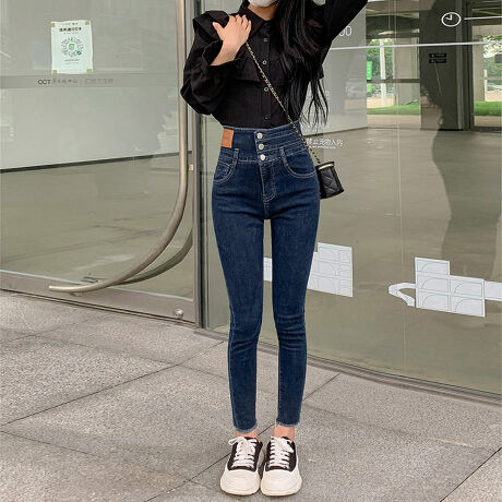 ハイウエスト&引き締め3連ボタンでキレイに魅せる、ストレッチ素材だから脚にぴったりフィットで美しいスキニーラインに