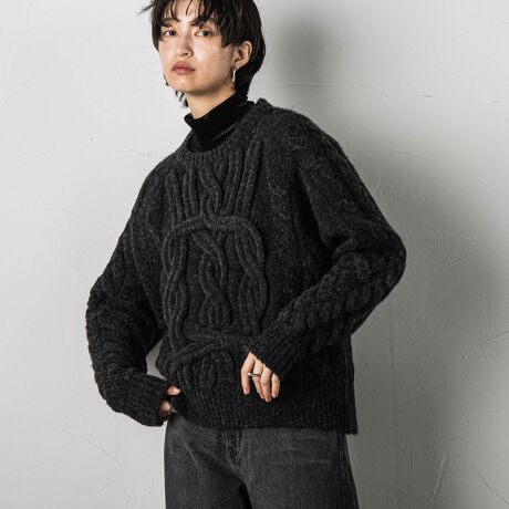 立体クラフトケーブルが逸な1枚で華やぐ、大人ケーブルニット。