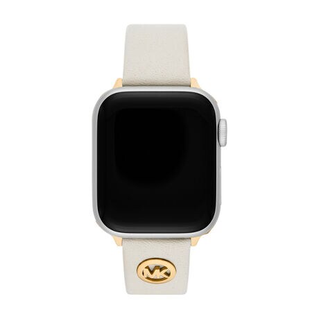 クリームのレザーを使用したMichael KorsのApple Watch用バンド。Apple Watch Series 1-10 または SE専用のデザインです。38/40/41/42mmと42/44/45/46/49mmのケースに対応する、付け替え可能なエンドピース2つがセットになっています。Apple WatchはApple, Inc.の商標です。