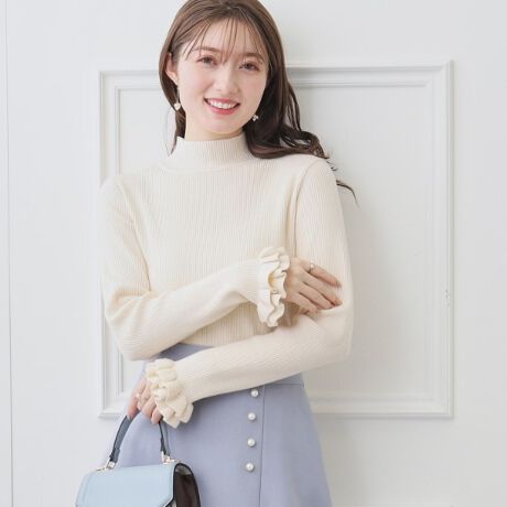 バックフェイクパール袖口フリルハイネックニット
