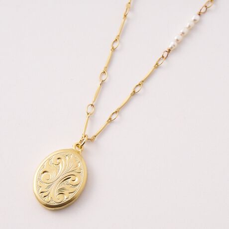 人気のロケット風ペンダントトップネックレスの新作が登場。天然石部分を上品な淡水パールを施し、プレスしたスティックパーツを連ねたチェーンとライス型のパールを組み合わせました。