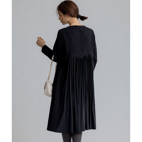■デザイン背中のバックプリーツが目を惹くドレスは、シンプルさと華やかさを織り交ぜた大人の余裕を感じられる1枚です。正面はシックなAラインシルエットで女性らしい襟元のあきにこだわり、ウェストの高い位置でさり気なくシェイプしています。後ろにたっぷりととったプリーツを裾に向けてなくすように加工することでシルエットにエレガントな動きが生まれます。後ろ姿の流れるように美しいフィッシュテールシルエットは横からみた佇まいも素敵。インナーにタートルを合わせたり、組み合わせる小物次第でスタイリングのイメージをガラッと変えてくれます。