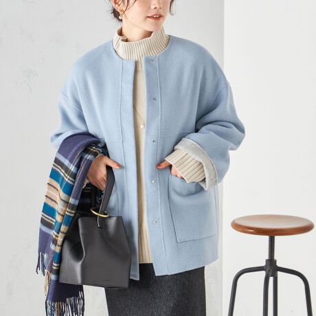 リバーコートでは珍しいリバーシブル仕様のノーカラーコート。