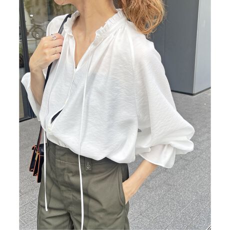 ギャザーたっぷりなシアーブラウスでゆるっとしたシルエットがどんなスタイリングにも合わせやすく、袖のボリュームも袖口にゴムが入れたパフスリーブが気になる二の腕もカバーしてくれ、着映える一枚です。