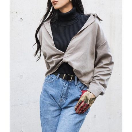 裾ツイスト ピーチスキン 抜き襟 シャツ 長袖