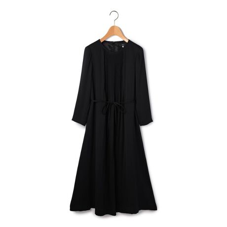 シルクのような風合いと上品さが特徴のサテンジョーゼット生地で仕立てたワンピース。フロントには細かなプリーツ入りでエレガントなムード。適度にドレープ感のあるフェミニンシルエットも魅力。ウエスト紐は取り外し可能で、ウエスト紐あり・なしと、異なる雰囲気を楽しめます。一枚でおしゃれな着こなしが実現するアイテムです。
