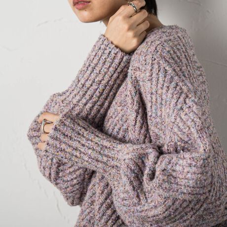 ウール混ながらも滑らかなタッチと、優しい肌心地のバルキー糸に、多色使いのループヤーンをミックスさせた大人のカラーネップヤーン。