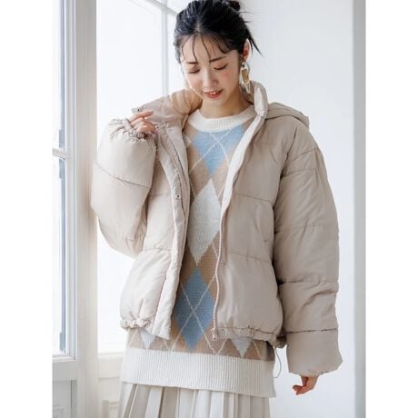 ふっくらとした中綿入りであたたかく着用出来るフード付きジャケット。