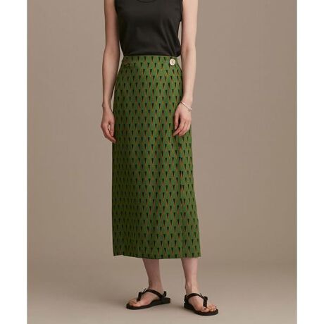 深みのある色合いのバティック柄が印象的な、Iラインの巻きスカート。上品に合わせられるロング丈で、フラットなサンダル合わせで真夏でも履きやすいデザイン。同素材のシャツとセットアップはもちろん、デイリーからリゾートシーンまで幅広く頼れる1枚です。