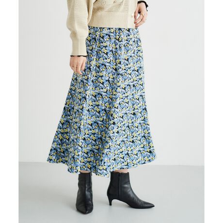 暗くなりがちな秋冬コーデに華やかさを足してくれる花柄スカート。