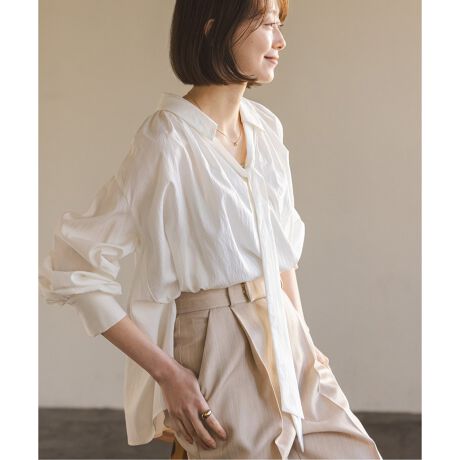 すっきりとしたスキッパーの首元に長めのボウタイを添えた、抜け感がありながらもキレイ見えも叶う優秀デザイン。
