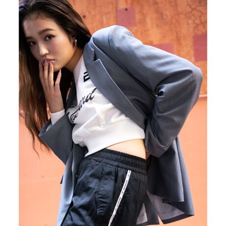 トレンドのビッグシルエットで中に厚手のニットやスウェットを着こんでも様になるテーラードジャケットです。