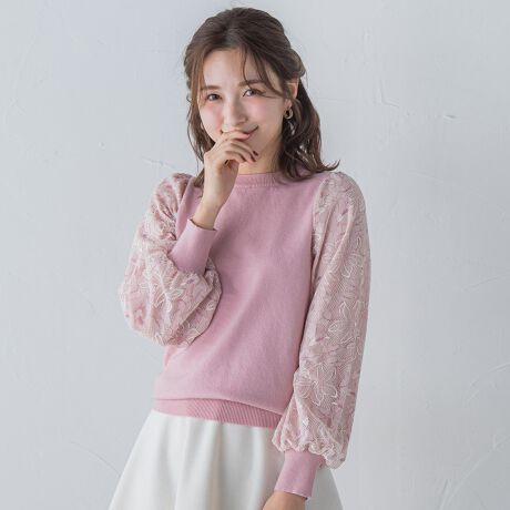 布帛とレースを重ねたお袖がエレガントなニット。