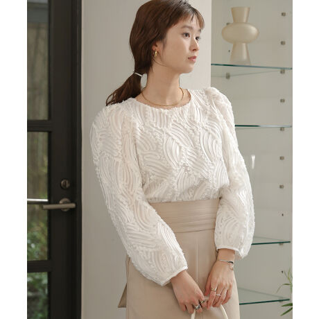 上品な立体感のあるバテンレースが全体的に施されたプルオーバーブラウスです。さりげないパフスリーブがフェミニンさをプラスし、タックアウトでお召頂いてもきれいなバランスが取れる絶妙な着丈も嬉しい、シルエットにもこだわった1枚です。オケージョンブラウスとしてももちろんですが、デイリーユースとしてカジュアルミックスの着こなしも楽しめます。