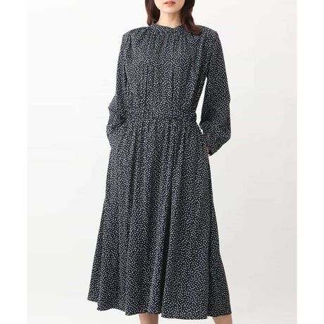 ランダムな変形ドットが大人可愛いワンピース。たっぷりとしたギャザーと分量感が女性らしさを引き立てます。落ち感があり広がりすぎないので、すっきりと着こなせるのも嬉しい。