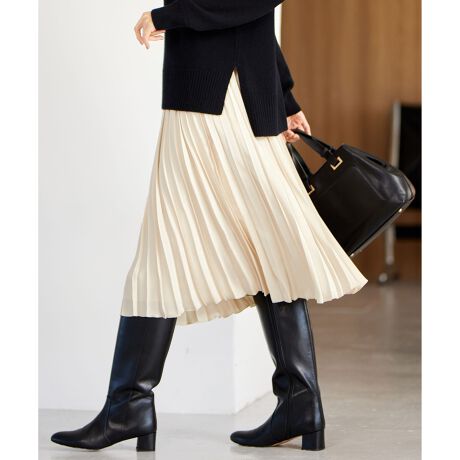 【WEB限定】動くたび揺れ感が美しい万能プリーツスカート■デザイン上品な光沢のサテン素材をたっぷりと使用したプリーツスカートです。リズム感のあるさりげない変形のアコーディオンプリーツで、たっぷりとしたボリュームがありながらも軽く、動いた時の揺れ感が美しいデザインです。ジャケットに合わせた通勤シーンや、ニットやカジュアルトップスに合わせたデイリーシーンのどちらにも着回せる汎用性の高いスカートです。ウエスト部分はゴム仕様なので快適な着心地です。■素材シルクのようなタッチとふくらみを感じられるシルキーサテンです。少しだけシワ加工を施すことで、適度な光沢感と柔らかくしなやかな落ち感の出る、上品で大人っぽい表情のサテンに仕上がっています。たっぷりとしたボリュームでも重くならずに、美しいドレープが特徴です。