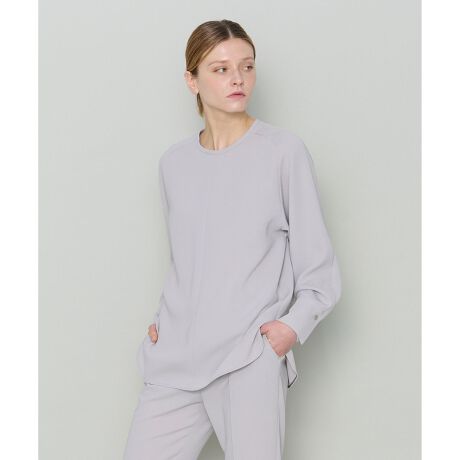 ■デザイン リラックスフィットのブラウス。ドルマンスリーブでゆったりとした着心地と女性らしいシルエット。生地のドレープ性を活かしたシンプルで構築的なブラウスは、共生地のスカートやパンツと合わせ、セットアップで着用可能。