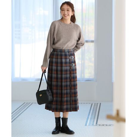 デザイン・太めのバックルがコーディネートのアクセントになるプリーツスカート・バックル部分にあしらわれたフリンジと暖かみのあるチェック柄が、これからの季節にぴったり・ウエストはゴム仕様なので、楽に履いていただける・普段使いだけでなく、クリスマス等のイベントにもおすすめな1着