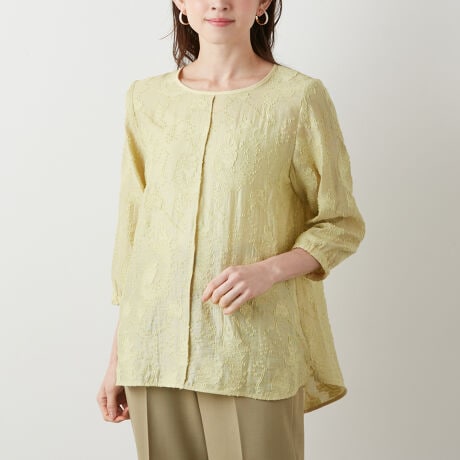 [型番:3241709]ほんのりと柄が浮かび上がるカットジャガードで仕立てたブラウス。柔らかなボリュームのあるスリーブがフェミニンさ薫るデザイン。脇ドロスト仕様となっており、寄せて生まれるギャザーの出す柔らかなドレープシルエットも優しげな表情を演出してくれます。バックネックはボタン留めで着替えも楽にすることができます。華やかな存在感があり、デートやパーティなどのお呼ばれスタイルにも活躍してくれるアイテムです。