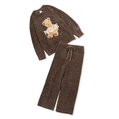 焼き菓子のような色合いのメランジカラーで仕上げた、'パウダー'素材のお得なセットアイテム。冬に温かい肉厚な'パウダー'に、ふわふわのPIQUEベアとロゴジャカードをデザインしました。プルオーバーの左袖口とロングパンツのバックポケットに、ロゴ刺繍が入っています。色はベージュとブラウンの2色展開。同素材を使用したソックスもご用意しています。季節のギフトにもおすすめです。