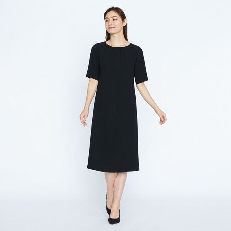 シンプルな中にもエレガンスが香る、洗練された大人の女性のためのバックサテンワンピース。ネックラインにタックをほどこし、裾に向かってさりげなく広がるAラインのシルエットに仕上げています。バックファスナー仕様。腕まわりをほっそり見せてくれるハーフスリーブもポイントです。