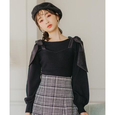 WILLSELECTIONらしいほんのり甘さのある存在感抜群の大人スウィートなニット【Design】・今年トレンドのビスチェをレイヤードしたようにデザインしたニットは、同じニット素材で編み地を切り替えたレイヤード風のデザインになっています。・肩紐はソフトオーガンジーを使用し、大きなリボンがより可愛らしいポイントになるようにハリ感のある素材で落とし込みました。・1枚で着映えするトップスは、ハイゲージのシンプルなリブ編みで仕上げているので、ミニ・ロングボトムどちらともコーディネイトしやすくなっています。・コーディネートはトップスインのスタイルでシルエットにメリハリをつけるのがオススメ◎・スカートだけでなく、パンツともバランスよくまとまるので、幅広いコーディネートと相性抜群です。【Fabric】・柔らかな肌触りの良いニット生地を使用。・ご自宅でお手入れが出来るのも嬉しいポイント♪・ホワイト、ブルー、ブラックの3色展開となります。【Care】手洗い可能
