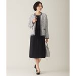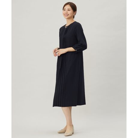 フロントにプリーツ加工を施し、縦のラインを強調したスッキリ見えを叶えるワンピース。膝が隠れるくらいの上品な丈感で、清楚感も引き立てられます。袖丈は8分袖で袖口にギャザーを入れてカフスをつけた、きちんと感のあるデザインです。共布リボンでウエストマークして、メリハリのある女性らしいシルエットも楽しめます。洗練された大人な印象のカラー展開で、オケージョンやフォーマルなシーンにもおすすめ。身頃のみ裏付きです。カラーは、定番のブラック(#005)とネイビー(#075)に加え、新色の華やかに決まるベージュ(#033)の3色展開です。