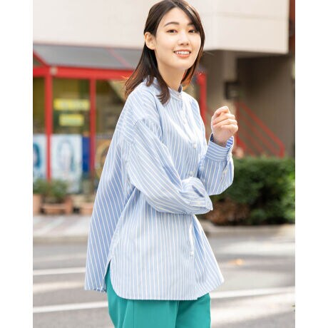 ポリエステル、レーヨンを使って細かくツイルに織った生地をセレクト。コットン単体に比べ強ばりが少なく、ほどよく身体に馴染み腹部も隠れる丈になっているため重ね着にも便利なシャツになっています。アイボリーボディにはベージュのストライプが織り込まれクリーンな雰囲気。アイボリーのラインが効いたブルーボディには清潔なブリティッシュ感が漂います。どちらも、ほのかな光沢でオフィスや学校行事での着用もおすすめ。着こなしに軽さの出るタートルインのスタイリングの他、カーディガンを羽織るスタイルも綺麗めにまとまり素敵です。