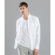 ■スタイリングベーシックで無地ながら、新しくなった折り柄が目立つ技ありシャツ。サッカー素材のようなシワ感もあり、カジュアルシーンからジャケットインまで幅広く活躍。